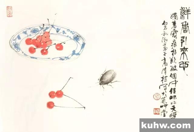 鲜香引来也:鲜红的樱桃放在洁白的青花瓷盘里,令人垂涎,然而却想来了使人生厌的土鳖虫,但它极宜入画,经过创作,化腐朽为神奇,意趣倍增。
