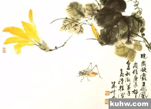 晓园凝露:浓重的瓜叶,俏丽的窝瓜花迎风摇摆,蝈蝈鲜红色的腰与鲜黄的花对比强烈夺目,清秋意境倍增,效果感人。