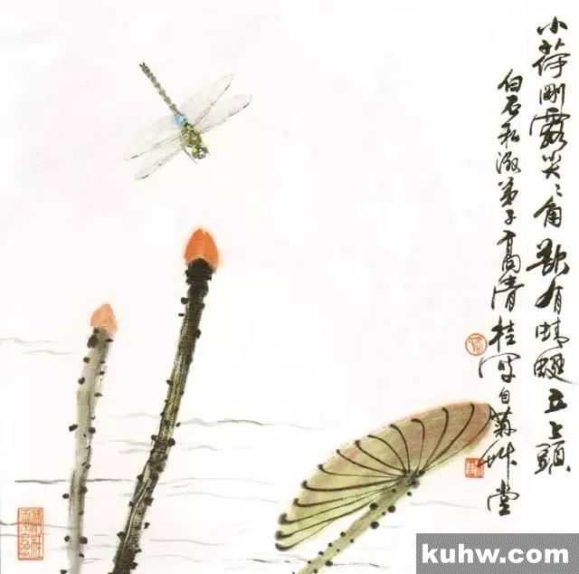 小荷尖尖角:小荷嫩芽挺拔向上,刚健的碧伟蜓正欲停息,几笔春水,描绘出开阔的空间和茁壮生机。