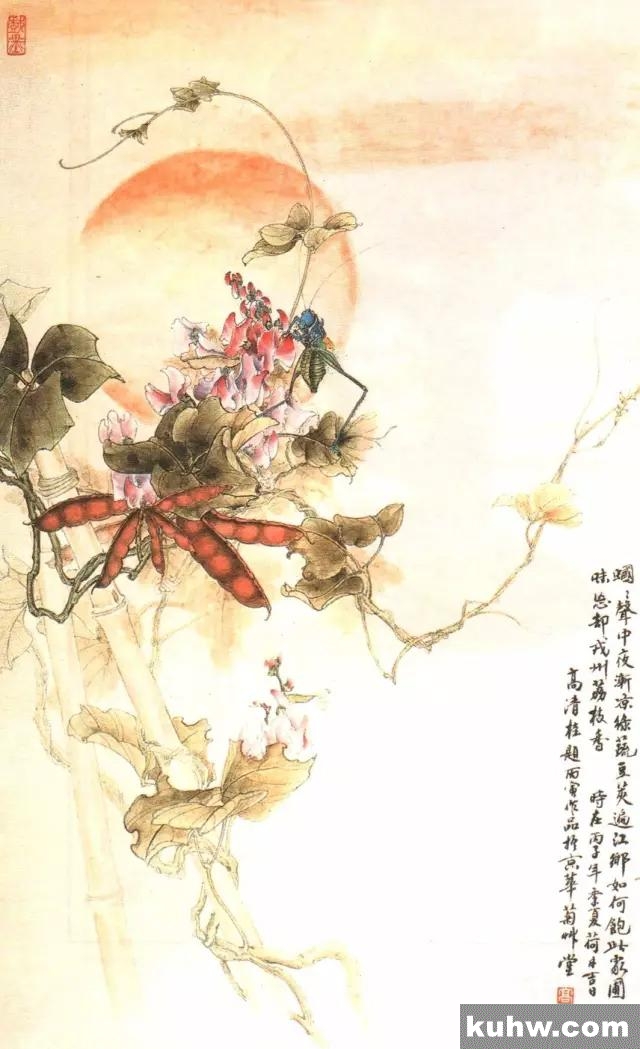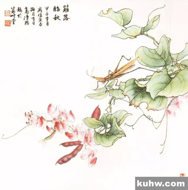 篱落临秋:山野村落,农家小院的篱笆上,串串豆角花临秋盛开,争妍斗艳,一只草白蚱蜢,更增情趣。