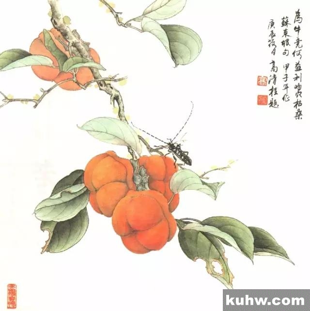 寒林垂玉:黑天牛爬行在通身熟透、珠圆玉润的红柿上,使人联想到满山、满坡层林尽染的秋意。
