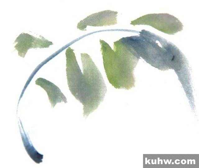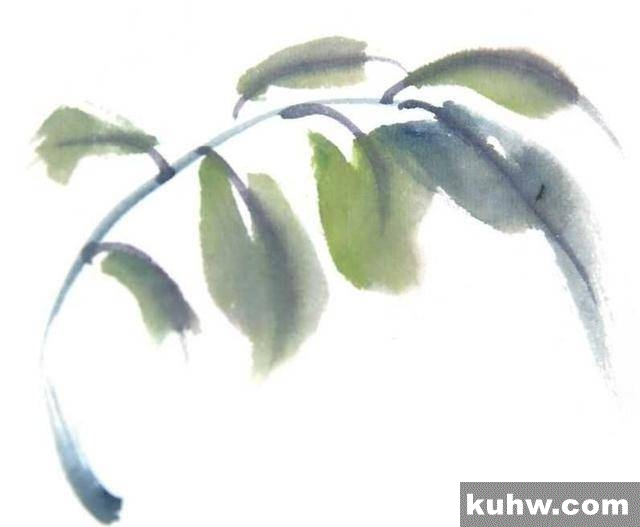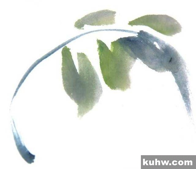 1 调和花青和藤黄,首先撇画出叶梗,再调淡色调以中侧锋扫画叶片。