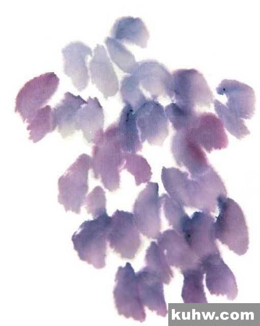 紫藤花花冠呈紫色,圆形。通常里侧的花瓣最先开放,尖端一般是花苞,所以颜色比较重。在绘制时可通过颜色浓淡的对比来体现层次。