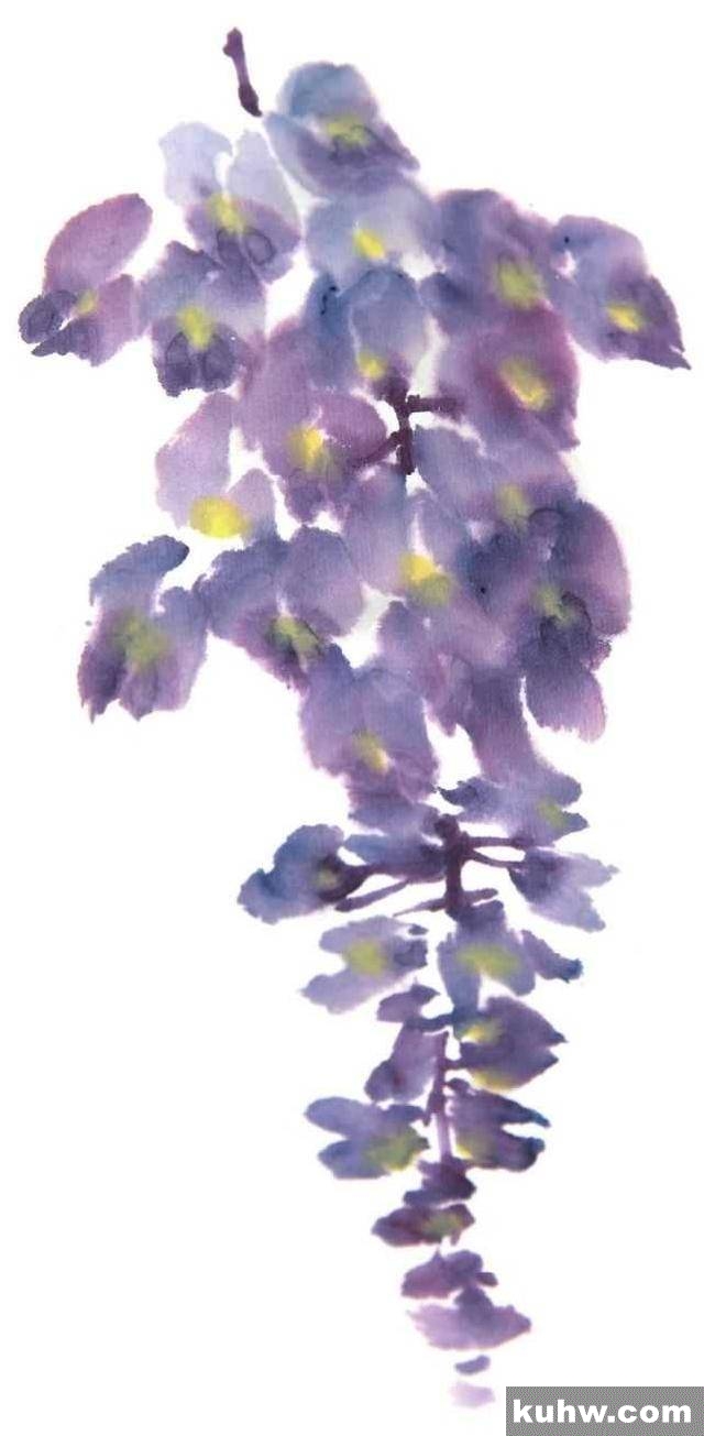 紫藤花开繁多,成串的紫色蝶形花瓣悬挂于绿叶藤蔓之间,别具浪漫之情。藤蔓粗粝、蜿蜒曲折,却也显得花冠愈发的淡雅幽香。细心描绘,才可使其在画面中繁而不杂。