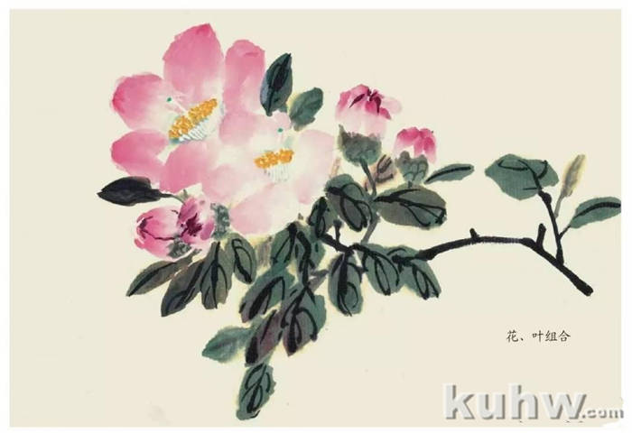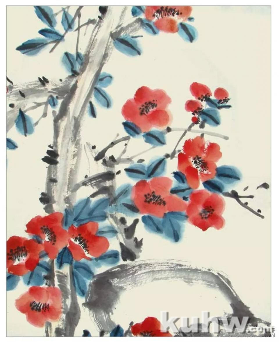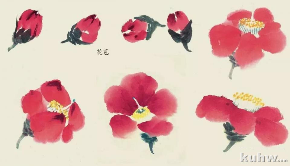山茶为常青灌木或小乔木。花单生或成对生于叶腋或枝顶,有白、红、淡红等色。叶互生,深绿色,卵圆形或椭圆形,边缘有细锯齿。山茶有单瓣类、复瓣类和重瓣类。花的画法:笔调浓朱�蘸曙红点花瓣,五瓣之间留空白画花蕊。雄蕊多枚,雌蕊一枚高出花冠,蕊丝以浓白粉(或墨)勾,花蕊用浓白粉蘸黄点成。白花以淡墨、渴笔勾花形,用汁绿在花瓣根部分染明暗,用白粉罩染花瓣。