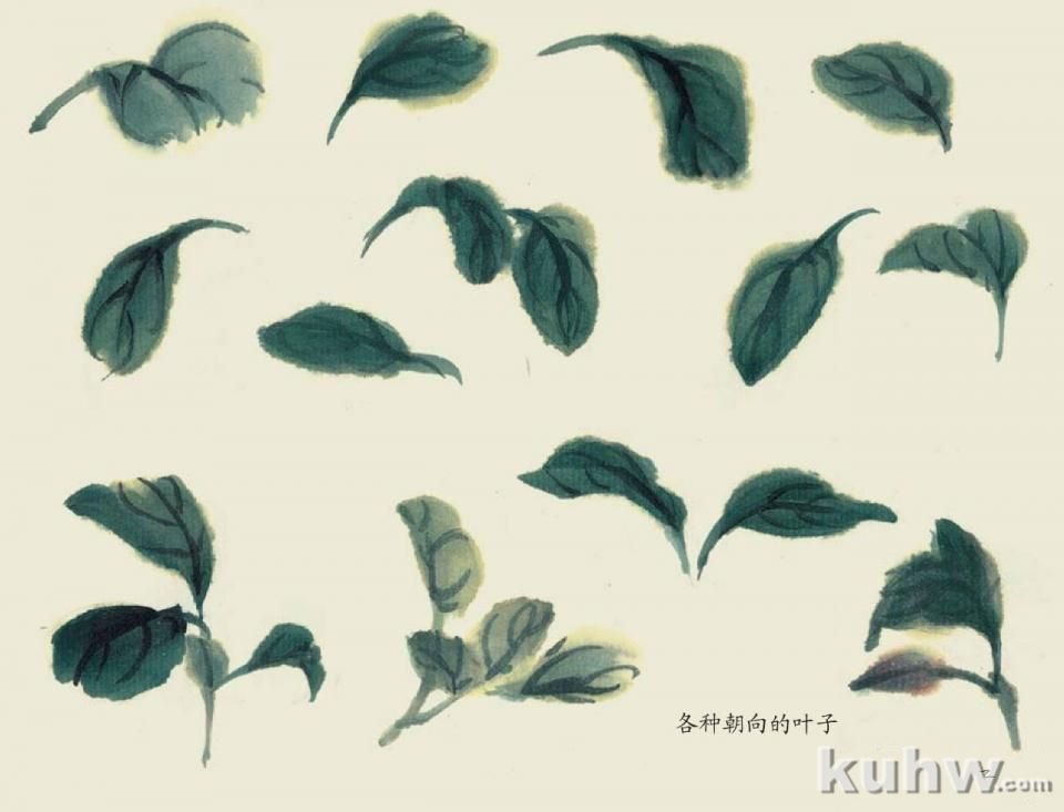 叶的画法:笔调藤黄加花青成汁绿,笔尖蘸花青(或墨)点写出,用笔要肯定。