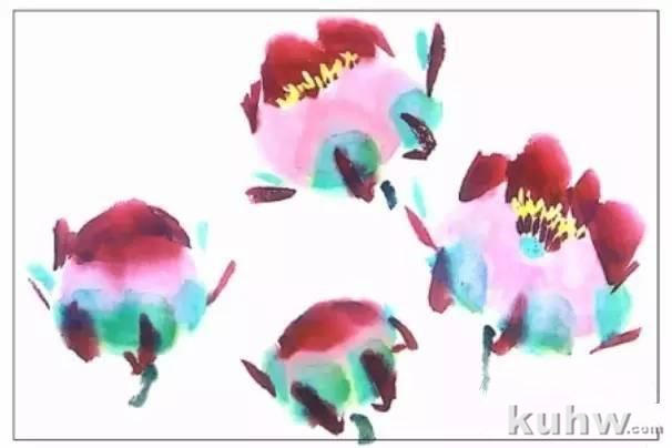 (3)在下部侧出深色大瓣下展,注意大笔小笔轻重交错,并稍偏一侧,略有透视感(近大远小)。
