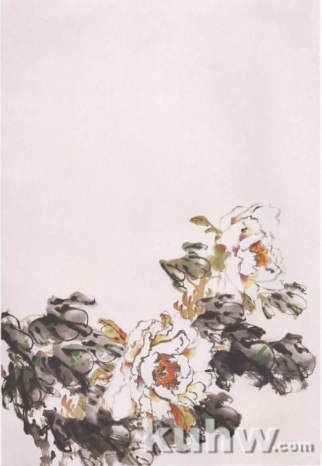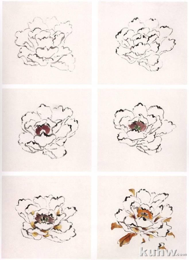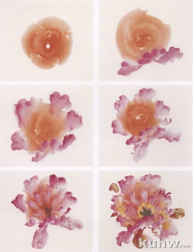 在画面上洒以矾水,干后以朱�写出花心处及内瓣的范围。淡粉红写外瓣,稍浓之色写内瓣,趁湿洋红勾瓣筋。石绿蘸洋红写雌蕊。浓白粉写花须,浓粉黄点雄蕊。草绿蘸朱红写复萼,墨红勾筋。