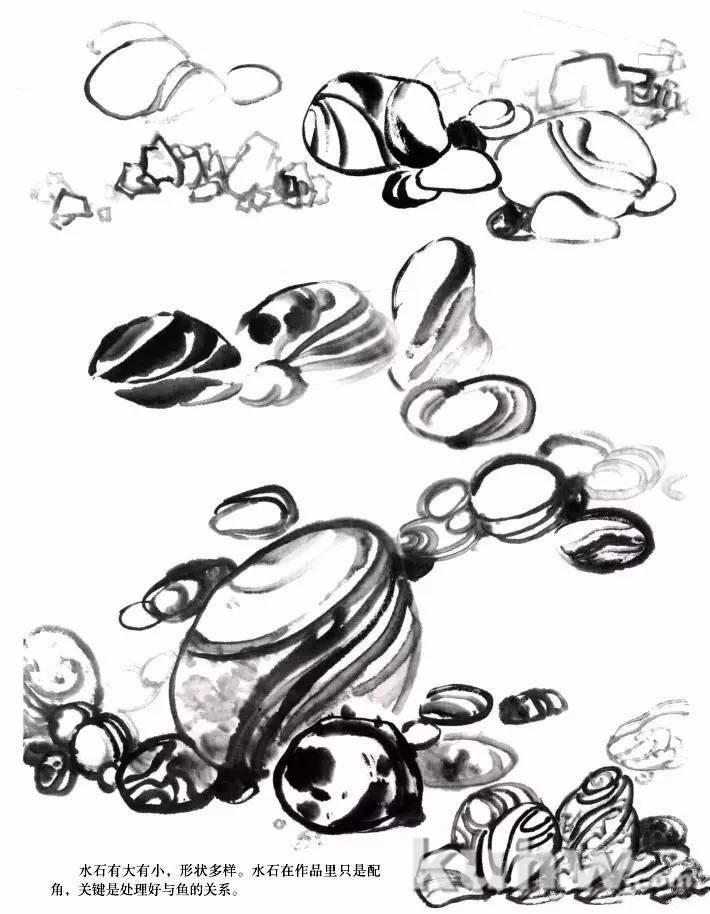 水石有大有小,形状多样。水石在作品里只是配角,关键是处理好与鱼的关系。
