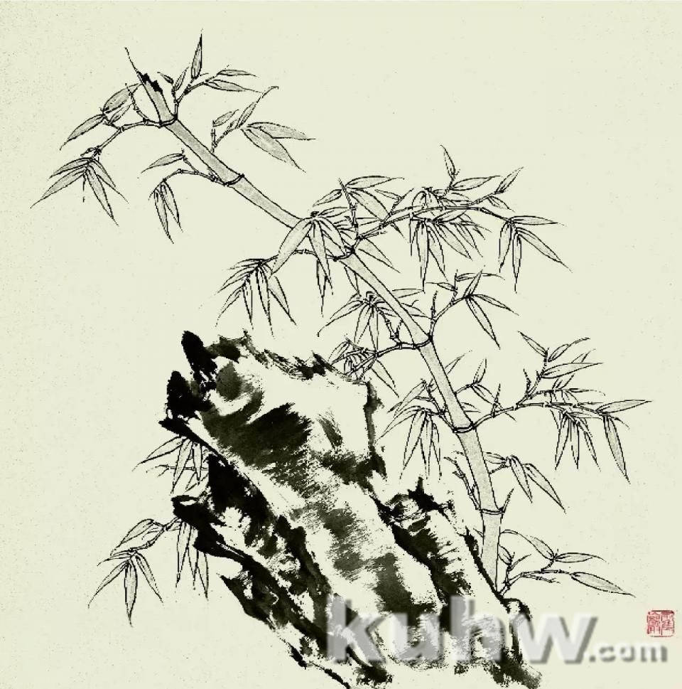 完成图:双勾竹叶。画出竹叶的穿插、遮掩的空间关系以及疏密关系。最后用淡墨加少许赭石渲染竹叶和竹竿。此幅画中石头用写意画法表现,竹子造型较为工整细致,一紧一松,一粗一细,笔法不同,意味不同。