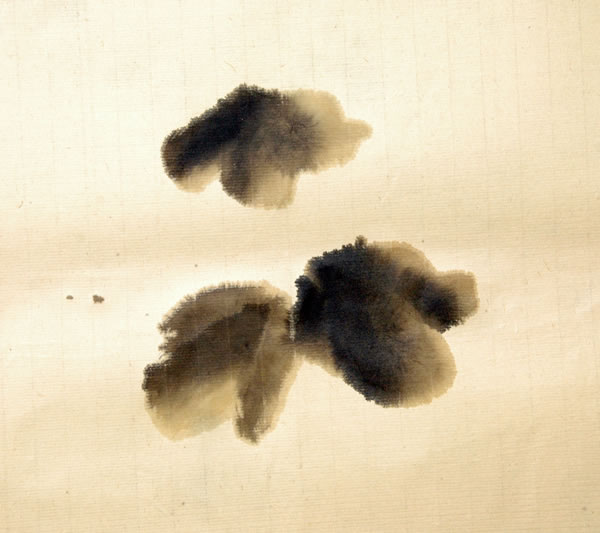 Now we are ready to outline leaves after finishing chrysanthemum inflorescences. Damp the brush in clean water before outlining the leaves, and then, using the tip of the brush to dip ink firstly with the side pen unfolded, (see picture:) sketching out the shape of different leaves according to aspects of inflorescences. Before the ink drying, using the