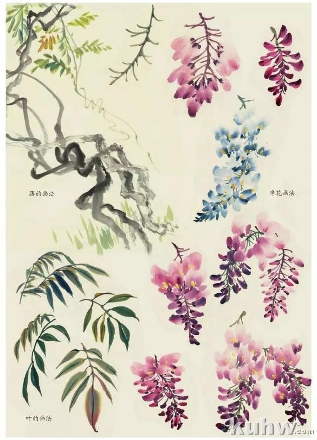 串花的画法:以花朵为基础重叠组合成串,在空隙中点画花柄、花梗,调白粉、藤黄在串花中有疏密地点蕊。