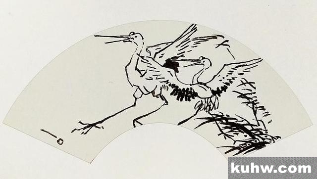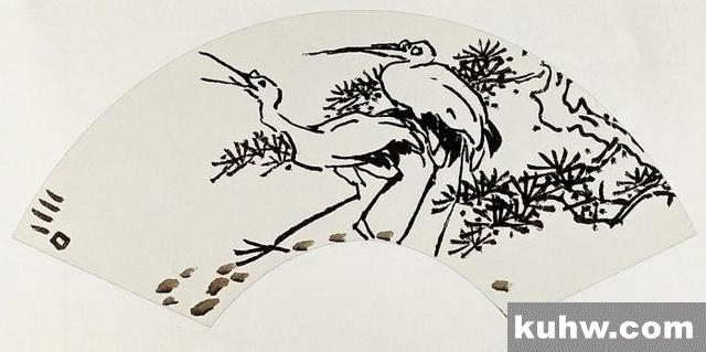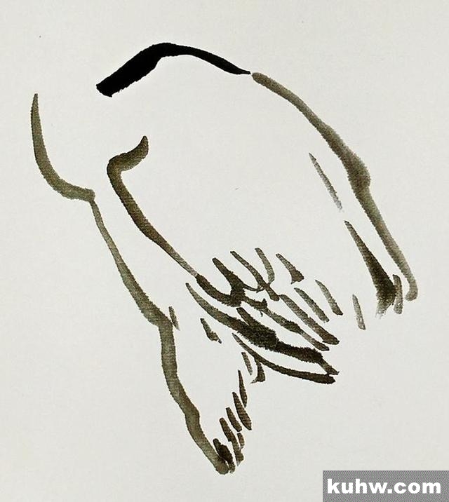 第一步:以较淡的墨色,先勾勒鹤的背部、胸腹部和大腿,定下鹤的身体位置。