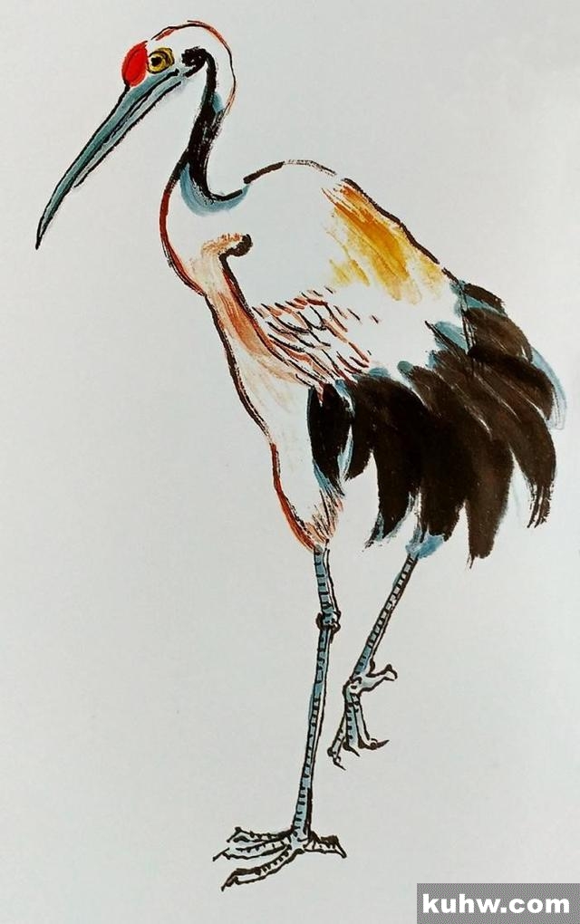 第五步:以朱红点鹤的头顶。调清灰染喙部和腿爪部分,也可在脖子和尾羽部分点厾。