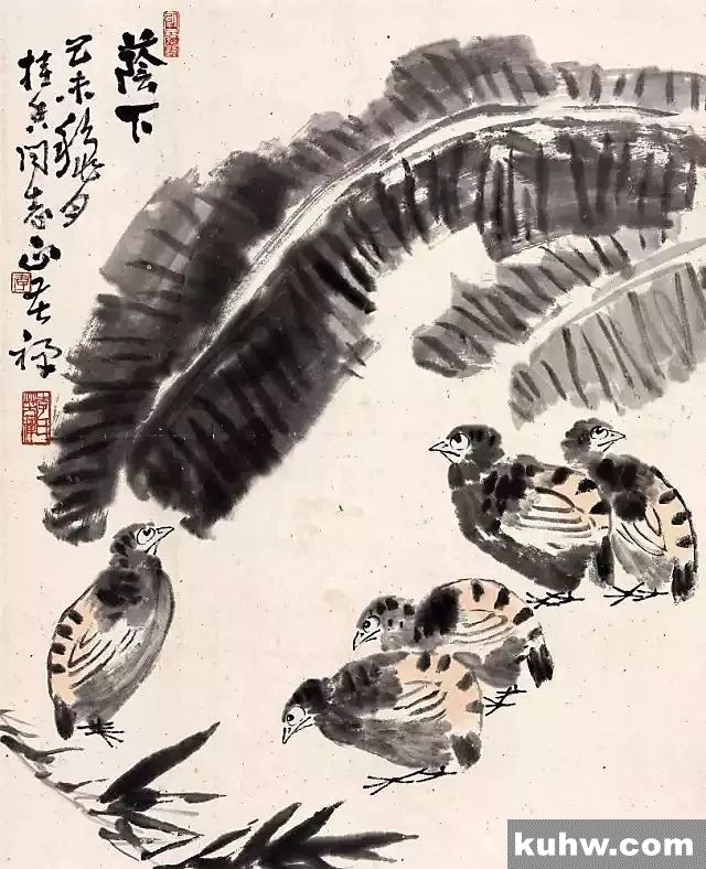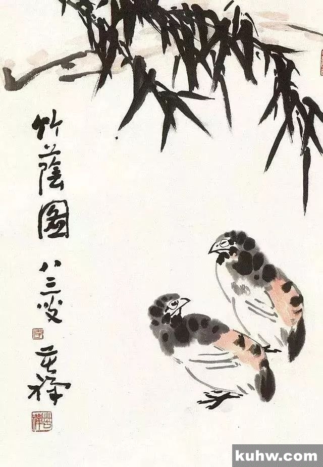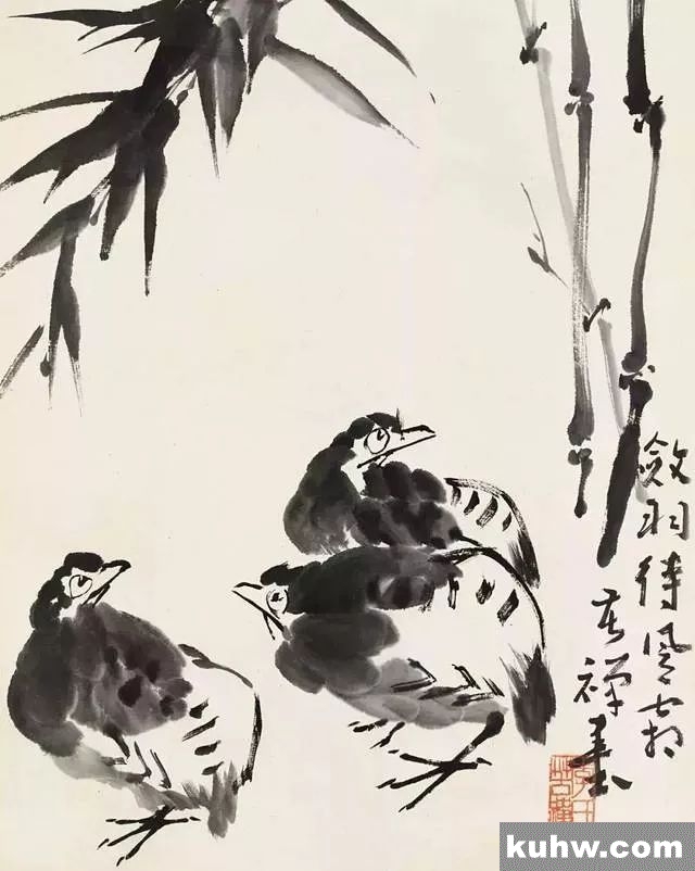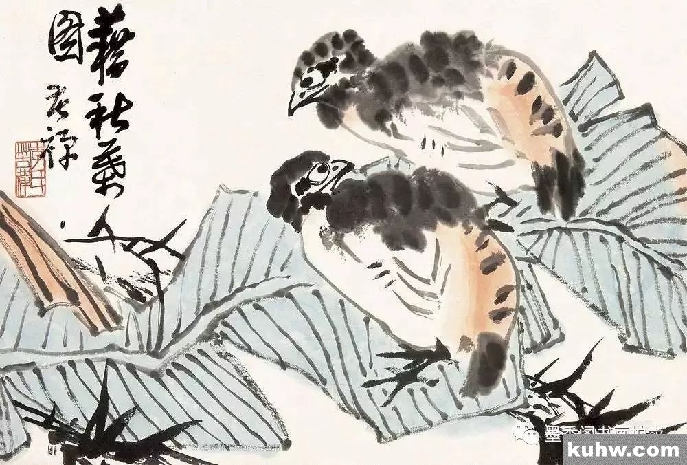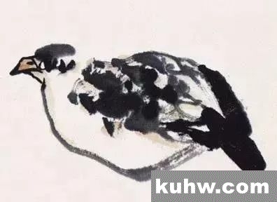 第六步:用浓墨根据动态画上足爪。用淡赭染嘴和背,注意嘴尖浓,嘴根淡,背部以似染非染为佳。