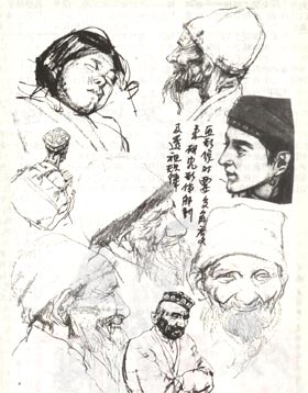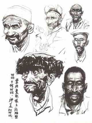 练眼,就是指训练自己的观察能力。我认为,练眼主要有两点,一要准确,二要整体。我说的准确,当然首先是指形体的准确,但更重要的是感觉上的准确。看到对象时,我们总是能够在大的形式上产生一个印象(如方脸、长脸或其他什么样的脸)。总之,这种感觉上的第一印象,是必须牢牢把握的。这种在大形式的前提下,对具体细节的深入观察,才是我们需要的准确。整体,是练眼的又一要点。眼睛要灵,看东西要整,不要把精神集中在局部上,这样容易琐碎,对将来画水墨画是不利的。我们要养成从大处着眼的好习惯,如远远走来一群赶集的老乡,朦朦胧胧的,大块的黑、大块的白、棕色的面孔以及那特殊的动态形成了―个整体,非常迷人,这个场面使你产生了强烈的表现欲望。等你让他们坐下来画的时候,你会发现刚才的美好印象减弱了很多,你再匆匆忙忙地从局部入手去画,效果更糟,足以把你刚才的感觉一扫而光。这是什么原因呢?就是―个整体的问题。刚才感人、令人激动的―瞬是整体配合产生的效果,要记住这―深刻的印象,坐下来画时,虽是从局部画起,却要牢牢地把握住这种感觉,尽量去追寻刚才那一瞬间的印象。这种整体的印象对于我们来说才是最重要的。有一句话送给大家:走近局部抓细节,退到远处观整体。(图为史国良的写生稿)