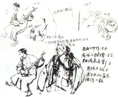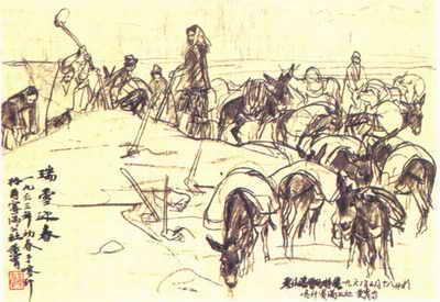 另外,我还要提到一个关于慢写的概念。慢写是缩短素描和速写之间距离的―个好办法。慢写带有一定的研究性,所以如果有时间可多作一些慢写。不管是速写还是慢写,目的都是为了研究造型规律。熟练地掌握这种规律,是向水墨画迈出的第一步。 (图为黄胄的《瑞雪迎春》速写稿)