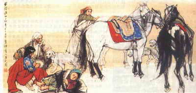在用色方面,前辈有不少能手,如任伯年、黄胄等。任伯年作画用色很多,但与笔配合得很好,起到了相得益彰的作用。用色不与笔性配合就像水彩画,水彩讲笔触,中国画讲笔味,即:书法金石味,这一点任伯年可称楷模。黄胄的人物画用色大胆,泼墨的沉着与色彩的艳丽形成了鲜明的对照;色衬墨,墨托色,响亮而协调。他不但吸收了西洋画用色的调子,而且大胆采用了民间色彩的处理办法,仍不失中国水墨画的风韵。