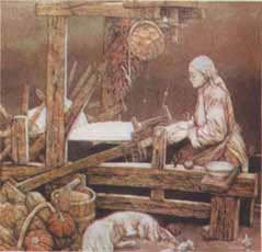 另一种是水墨撒盐法,可在水墨画出的形体上撒些盐粒,一定要在半干的时候撒,太干、太湿或撒得太多都没有效果,盐粒遇湿溶化后会冲开一些墨色,出现一种非常特殊的肌理效果。此法可用在画老树皮、老墙皮和山、石、草地、树林等物体上,不仅能够使这些物体质感强烈,还富有一种粗涩、浑然的沧桑感。我在长期的创作实践中,使用以上两种方法较多,也摸索出了一套经验,能运用以上两法画出各种物体和质感,我认为除了能熟练地运用正规的勾染方法外,学会一两种特技方法也很必要,不仅能够丰富画面的表现力,增添形象的感染力和美感,产生很强的视觉效应,还能丰富画面的视觉内涵和整体效果,给画面带来新鲜的活力。无论哪种方法,既玩就玩精、玩绝、玩地道、玩到家。当然,我所说的这些特技,是建立在基本功之上的,主要还是靠画,只不过是在画的基础上增加一些肌理效果而已,绝不仅仅是用水冲或撒把盐的事。你画不出来,什么特技方法也不顶用,再说盐对画面还有一定的腐蚀作用,一定要慎用、少用(图中的纺车、南瓜、水桶等用水墨撒盐法画成)。