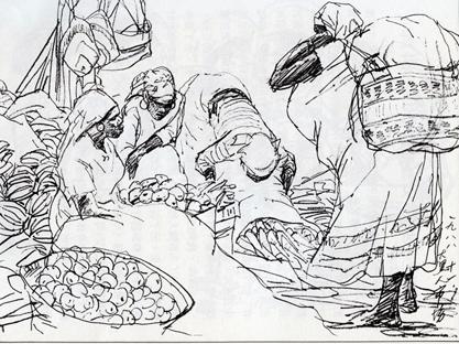 附图三这幅《非洲黑人集贸市场》的速写,是我在肯尼亚内罗毕讲学期间画的。我几次走进黑人市场,只见各种蔬菜、水果琳琅满目,加上那些着装五颜六色、姿态各异的黑人妇女的吆喝声响成一片,真是气氛热烈,一派浓厚的非洲市场生活景象。这些黑人妇女不让人拍照,不让人画像。我便藏在市场的一个角落里,偷画了几张速写,这就是其中的一幅。