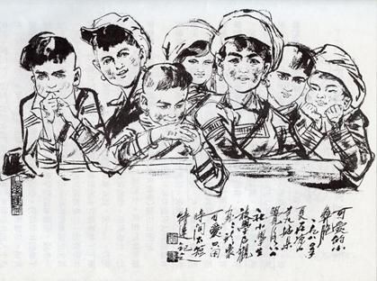 附图四这幅《可爱的小彝胞》是这样画成的:一群小彝胞放学后围观在我们四周,他们活泼天真,形态生动,脸和手虽不那么干净洁白,但身体却十分健康。我刚画完一张头像,顾不上收摊’铺好一张宣纸,用毛笔蘸墨,一口气画完了这群孩子。可以说是带着激情画的。虽然笔法粗糙一点,但是显得生动。