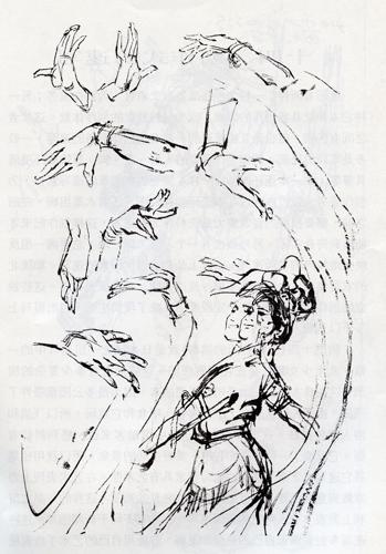画舞蹈人物时,人物的脖子不要画得太硬,重心不要画得太稳,这样动的感觉会强一点。画舞的线条,一般用得比较舒畅’不要画得拘谨板结,使人感到舞不起来。附图十三这幅《飞天舞》局部,以及手的动作速写,带有很多默写和记忆的性质。
