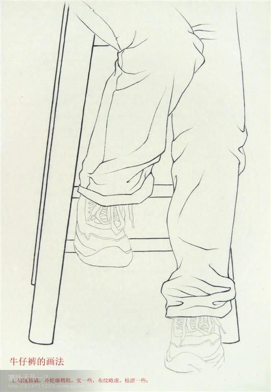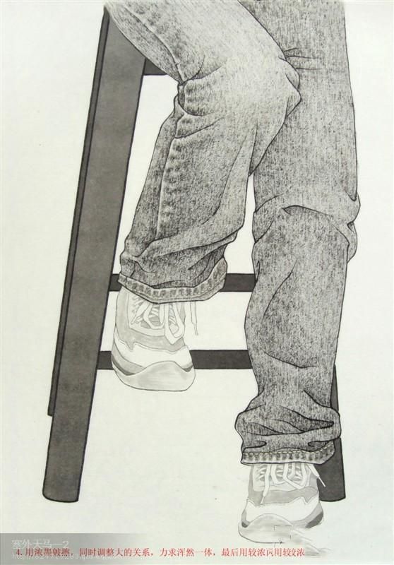 3.用中墨继续皴,不要追求明暗和立体效果,要平平的擦,裤头和裤边缝线等处要强调一些;