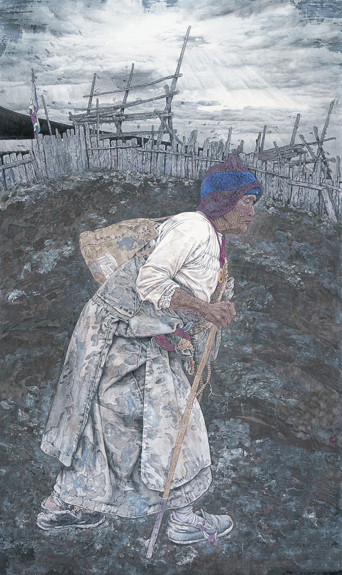 有人在看完《在路上》后向我提出老人皮肤的线条是不是太过夸张。画面中的老人是我在拉卜楞寺附近遇到的。老人的皮肤就像画中所展现的一样,满是皱纹,像被风干一般。生活向我们展示着无穷无尽的动人形象。在工笔人物画创作中,我们既要忠实地记录生活,又要将人物最具特点的部分突出呈现出来。