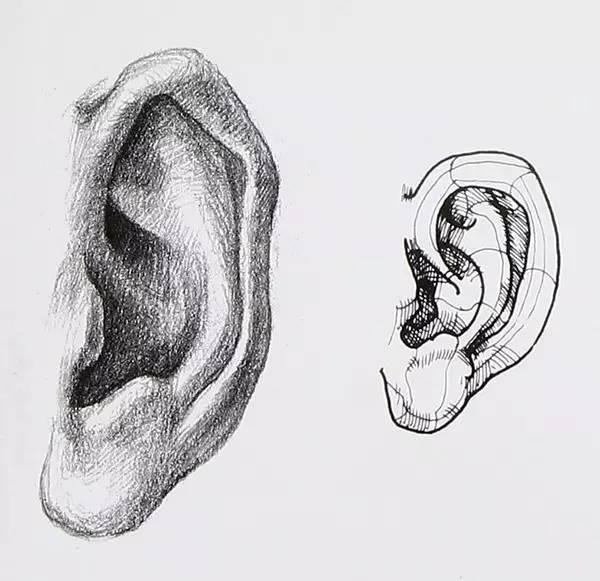 首先, 虽然每个人耳朵的外形特征各不相同, 但结构却基本一致。并且, 当头部平视时耳朵是斜着的, 总体倾斜度与鼻梁近似。其次,因为耳朵大部分是由具有弹性的软骨组织构成的, 外部形态呈现方中有圆、圆中带方的感觉, 所以耳朵的外轮廓一定要画出体积感。