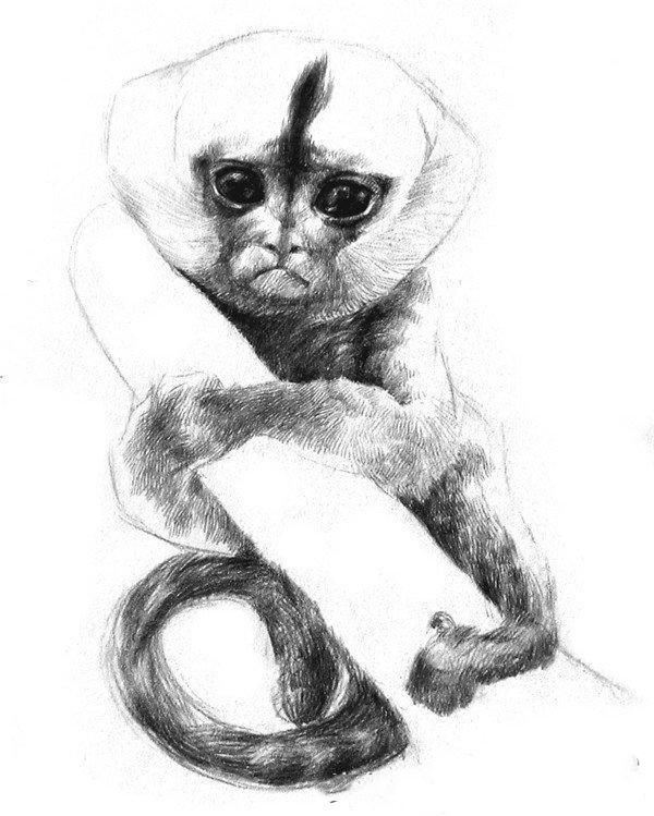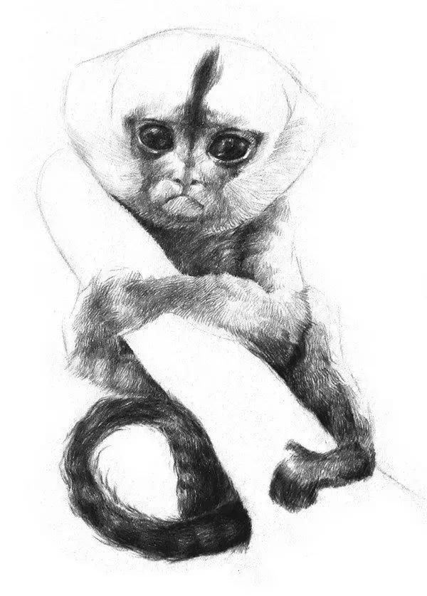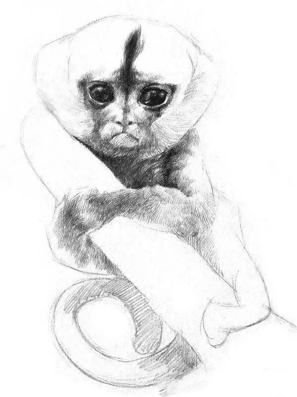 12、把面颊上较亮部分的毛发一起画完,加深一下嘴巴周围、下巴下部、抱着的手指周围,一只小眼镜猴就完成了。