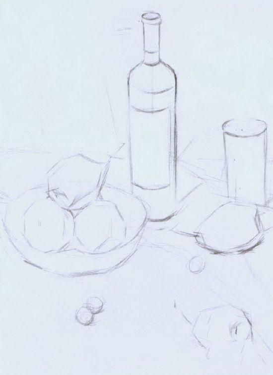 步骤一:勾勒平面和背后立面衬布的边线,然后通过基础阶段练习的简单几何形状勾勒出静物形体,确定好整体构图,在此阶段我们运用了几何形体练习阶段的课程: