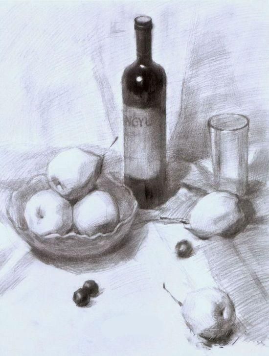步骤二:用较为清晰的线条勾勒衬布边线,同时对物体形状进行具体描绘,画出暗面。再画出衬布褶皱的暗面,同时开始绘制玻璃盘底部的暗面。用笔轻轻画出水果的明暗交界线以及大致给红酒瓶铺上明暗。
