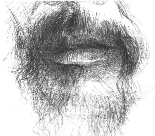 步骤一 嘴部周围的胡须要分为三组来表现,打形时应透过胡须把嘴唇及周围的形画完整。