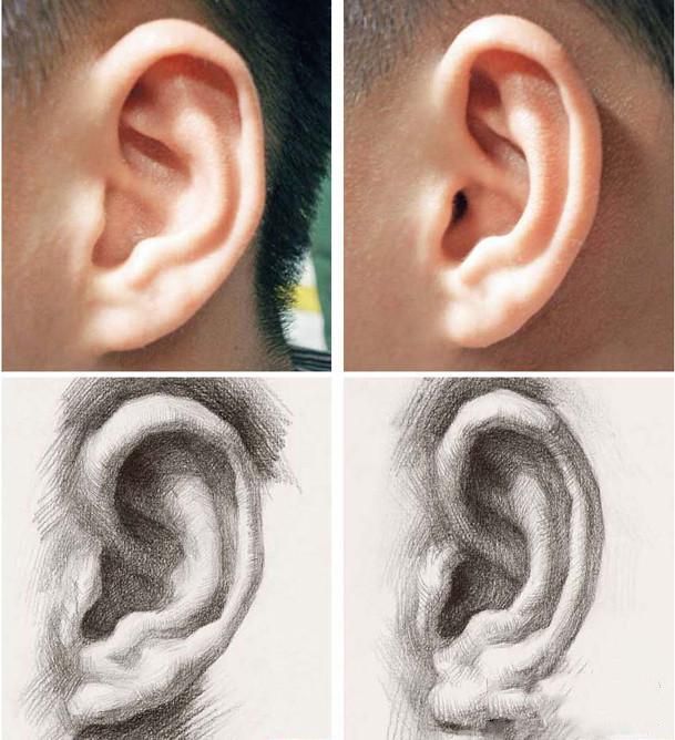 首 先, 虽然每个人耳朵的外形特征各不相同, 但结构却基本一致。并且, 当头部平视时耳朵是斜着的, 总体倾斜度与鼻梁近似。其次,因为耳朵大部分是由具有弹性的软骨组织构成的, 外部形态呈现方中有圆、圆中带方的感觉, 所以耳朵的外轮廓一定要画出体积感。如下图, 通过对形体交界线、反光、灰面和亮面的刻画,就能较好地塑造出体积感。因为耳朵上方的三角窝多数情况下都会含在暗部中, 所以对耳轮上的受光面、灰面、交界线以及反光和投影等都是我们刻画的重点。相比耳轮、对耳轮和耳垂,耳屏、三角窝和耳道在空间上比较靠里, 为了拉开它们之间的前后空间, 我们在塑造时就应适当减弱靠后部分的黑白对比。并且, 耳屏不是一个简简单单的两个鼓包, 它是由两个突起组成,因此要通过表现交界线的细微变化以体现其体积。耳垂有厚有薄,但无论厚薄都要通过画出其底部的交界线、弧面、亮面和反光来体现体积 感。另外, 耳垂前面与头部衔接的部位并不是已调简单的直线, 它的起伏转折还需根据不同情况认真表现。