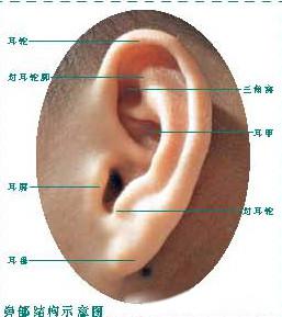 耳朵的形状是不规则的壳状, 其轮廓呈C型, 上宽下窄, 中央是一个凹形碗状体。耳部主要由耳轮、对耳轮、耳屏、三角窝和耳垂等几个部分组成。(具体参考上图)