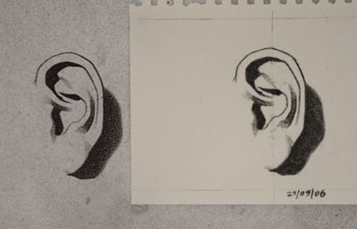 考虑到我花了三个小时画这耳朵,这有点令人失望,看看我。但它也是非常有益的。如果我不做这个检查,我就愉快地走在我的思维方式,我在做一份好工作。毫无疑问我以后会有问题板图纸时复杂得多。如果我不能得到一个简单的绘图这样的爆炸,然后我知道我以前很长一段路要走我的眼睛是足够可靠的判断差异。这些错误似乎并不那么糟糕,但如果这是一幅肖像,这种规模的错误我想足以破坏相似。