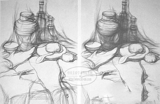 在默画出大的几何形态的基础上,要进一步分出各个形体的基本比例关系,画出各个物体的基本形,并用水平、垂直线等校正各形体之间的相互关系:每个物体都有自身的比例关系,而在一组静物中又有物体相互之间的比例关系,在这两种比例关系中,后者是首要的。默画考试中考生最容易在相互比例关系中出现各种错误,只有做到了物体与物体之间的比例关系正确,进一步画小的局部的形体比例关系才有依据,才能画准确
