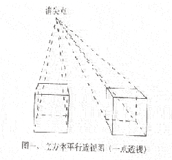 一点透视就是说立方体放在一个水平面上,前方的面(正面)的四边分别与画纸四边平行时,上部朝纵深的平行直线与眼睛的高度一致,消失成为一点,而正面则为正方形