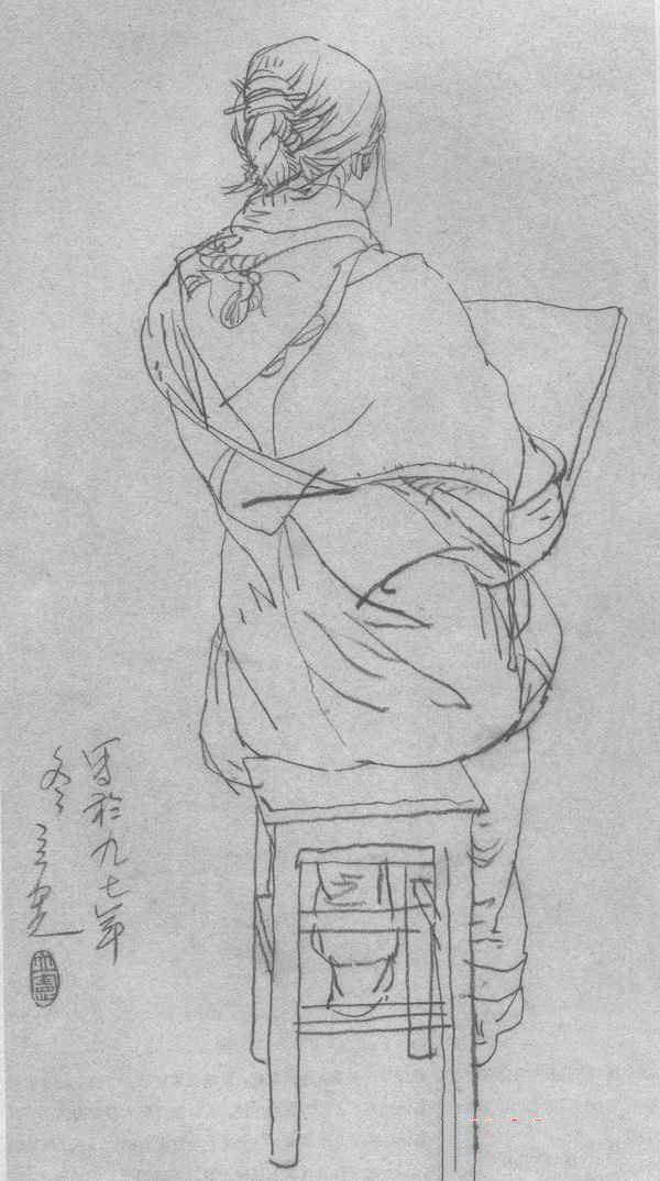 完全正对的背影,是人们在速写时经常回避的角度,其实无论在绘画中还是文学作品里,背影经常是艺术家感兴趣的题材,背影的描绘可给观者更广阔的联想空间,可使作品更含蓄和更富感染力。这幅姑娘的背影,我特别注意了她微颌的头部轮廓与肩部的动态关系,并着意捕捉了她稍稍一 左倾及轻轻右转的身姿,使得正对的背影立时有了S型的动感节奏。肩、背、骼部及臀部贴体的实线,在与沙巾、服饰的掩映 .中虚实穿插的贯通起来,使得整个动态平而不僵,微妙含蓄。