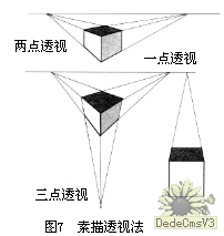 (3)三点透视。也叫倾斜透视。在两点透视现象中,其中上下方向的各边界与我们的视心线不垂直时,立方体各边延长线分别消失于三个点。