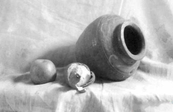 1:罐子和水果基本呈三角形,在构图时轻轻定出三角形的位置,这些物体不超过三角形的大范围,注意比例和透视关系。大体定出台面与衬布的位置形状,轮廓线不要太重!