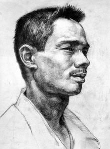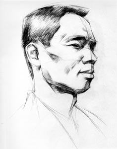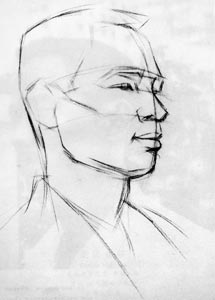 选择这种仰视的角度,可充分体现模特高大,壮实的特点,可先画出头部的最高、最低点,顶部空间少留一些,下面多留一些。由于青年是侧面正对前方,右边的空间应多留一些,给人留有想象的空间。然后用直线轻轻画出轮廓,定出五官位置。 对五官进行具体分析描绘,画出眼、鼻、耳、嘴的具体细节特征。这时要注意透视角度的变化对结构关系的影响。