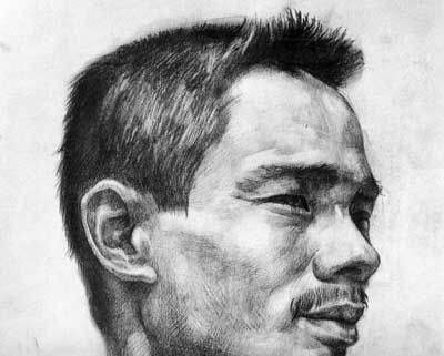 这个角度较难表现的是颧骨,耳朵及头发。描绘这几个地方时,切忌心烦意乱,而应理性分析。如刻画耳朵,是为了表现耳与头发、皮肤的关系;刻画颧骨、颞骨、是为了表现受光部的凹凸转承关系。头发的描绘要注意质感及随头骨的结构的起估变化。