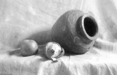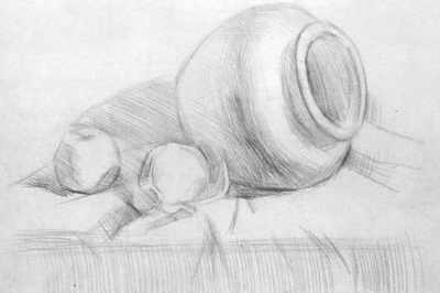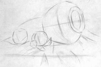 1:罐子和水果基本呈三角形,在构图时轻轻定出三角形的位置,这些物体不超过三角形的大范围,注意比例和透视关系。大体定出台面与衬布的位置形状,轮廓线不要太重!
