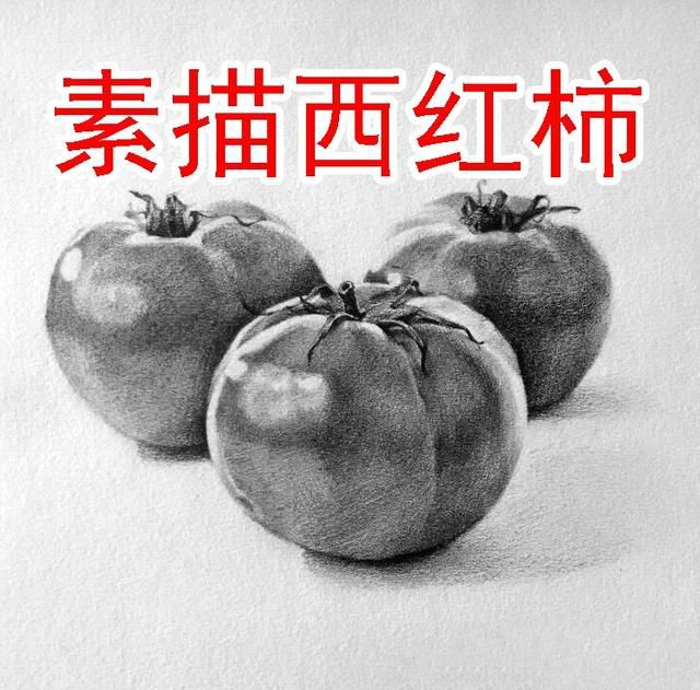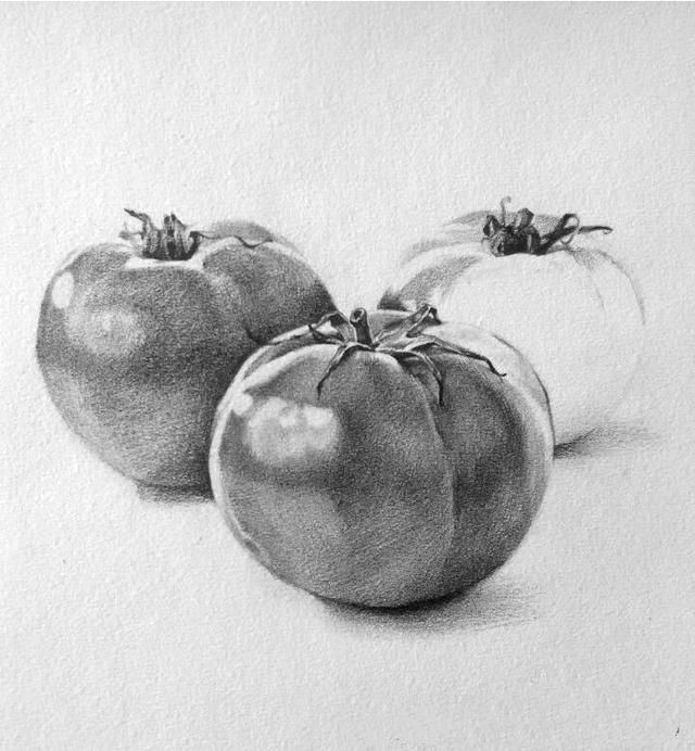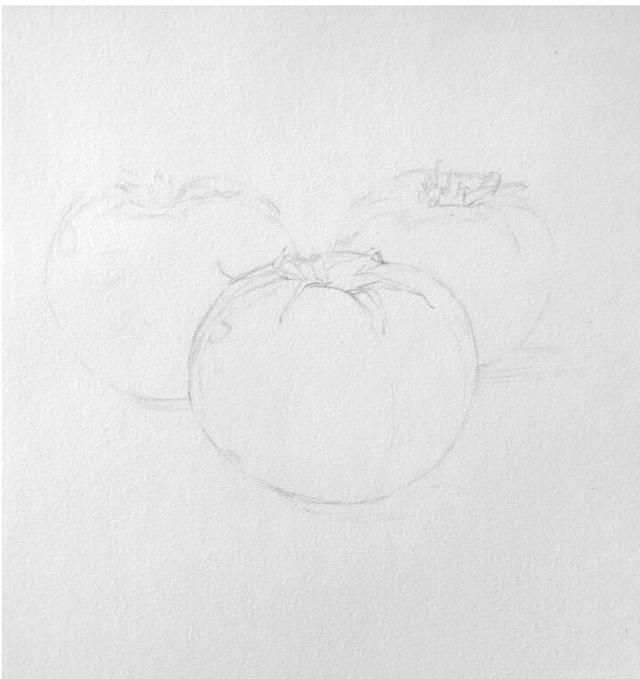 1、起型,观察对比三只西红柿的形态,用线时注意虚实关系。最前面的西红柿外形线最重要,后两只弱一些。勾勒清楚西红柿叶子的转折形态。以便以后刻画。