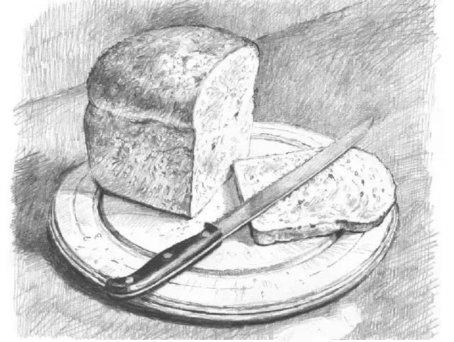 绘制本幅素描作品时,你可以使用多种样式的画法来绘制面包内外质感的差异、面包板上的面包渣以及刀锋的金属表面。
