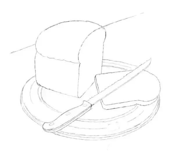 1.首先,轻轻地描出面包、面包板、面包片和刀具的大致形状。
