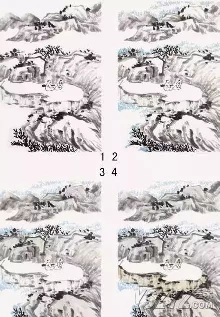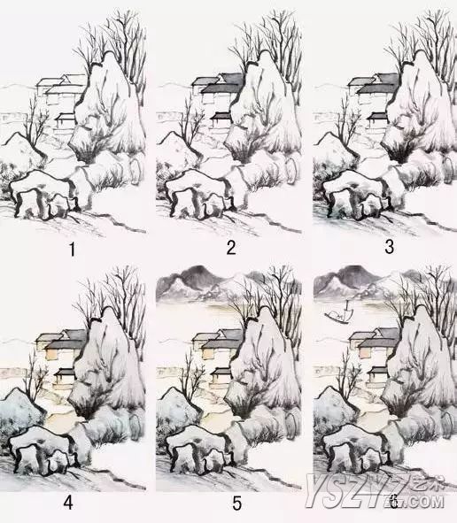 5、加上远山,近处用淡墨勾勒,远处用花青调墨直接画出。