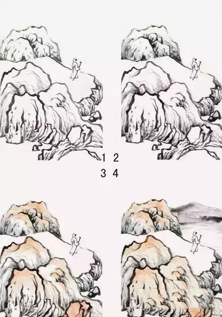 1、以短披麻皴画山石,有点景人物的时候,先画人物再画后面的背景。