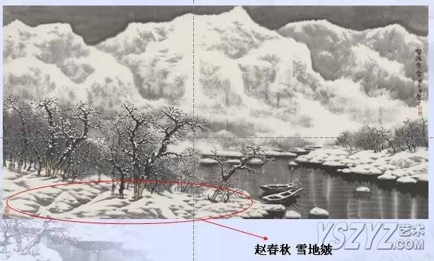 小贴士:画雪地皴的时候,注意笔里的水分,要求墨色由浓到淡过度自然,可以在试笔纸上反复试验,有把握了再画。